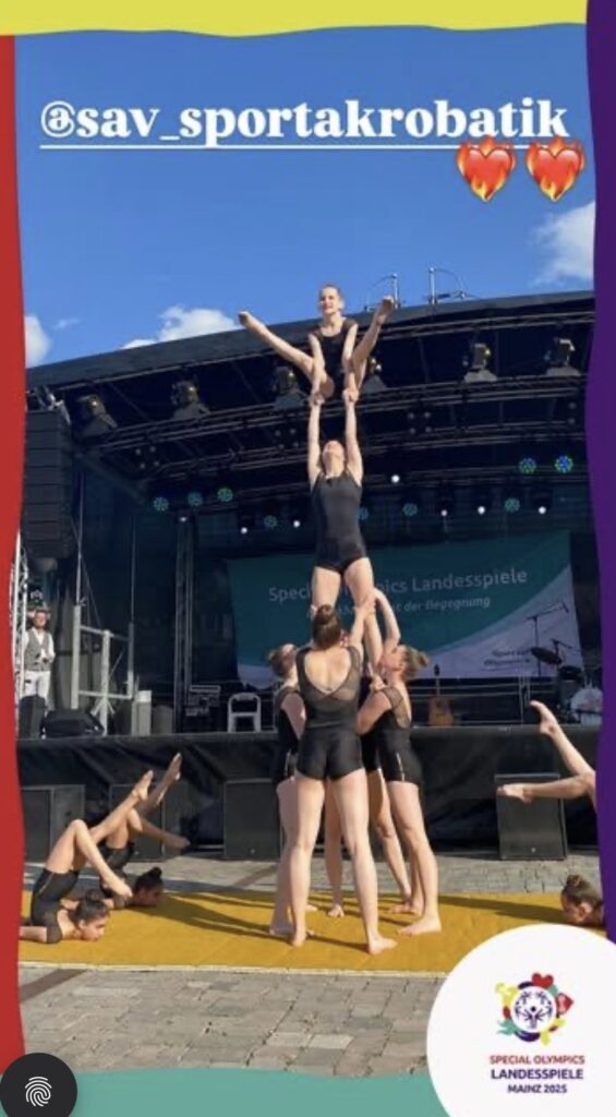 Sportakrobatik ist eine vielseitige und faszinierende Sportart, die Elemente ausTurnen, Tanz und Akrobatik verbindet. In Paaren oder Gruppen zeigen die Athleten und Athletinnen beeindruckende Hebefiguren, Würfe und Pyramiden kombiniert mit einer ausdrucksstarken, teils schauspielerischen Choreographie. Neben Kraft, Koordination und Beweglichkeit sind vor allem Vertrauen, Disziplin und Präzision entscheidend. Sportakrobatik stärkt nicht nur die Physis, sondern fördert die Teamfähigkeit, Resilienz und steigert das Selbstwertgefühl. Die Übungen werden auf einem 12x12m großem Sprungboden geturnt und nach Schwierigkeit, Technik und Artistik bewertet. Weltweit erhält die Sportakrobatik immer mehr Ansehen, mit dem ganz großen Ziel eine olympische Disziplin zu werden.